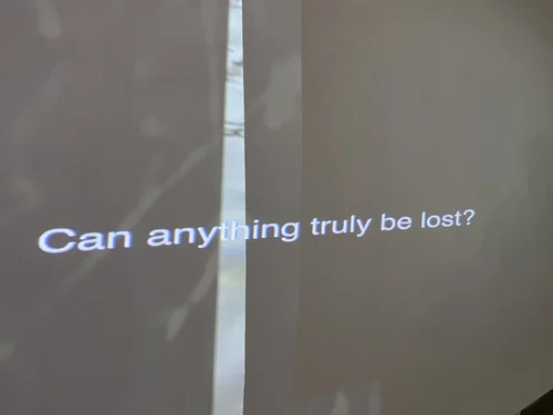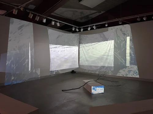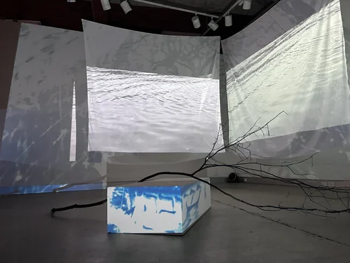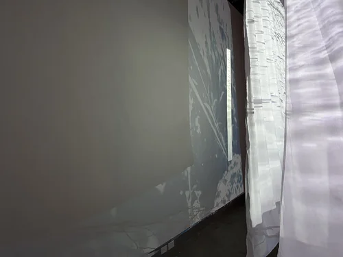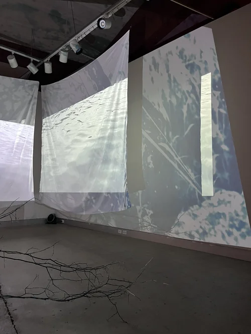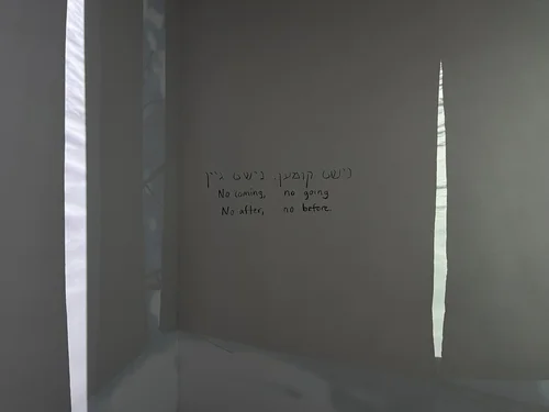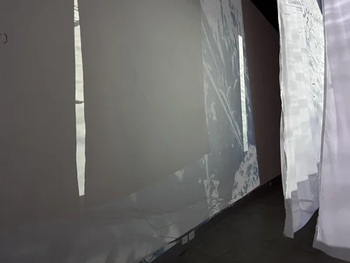 Behind fabric screens, fragments of Mississippi River footage open and close as a fan softly blows the screens. Charcoal handwriting on the wall reads “Nisht kumen, nisht gayen [in Yiddish]. No coming, no going. No after, no before”, an excerpt from the song of the same title by Sister Annabel Laity of the Plum Village community founded by Zen Master Thich Nhat Hanh.