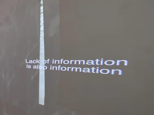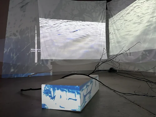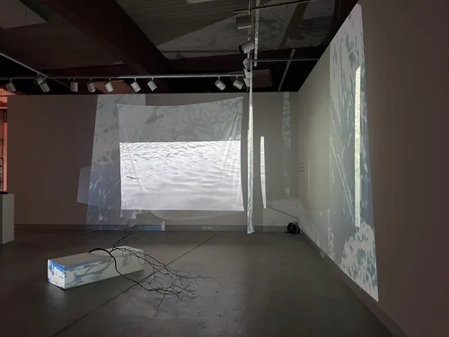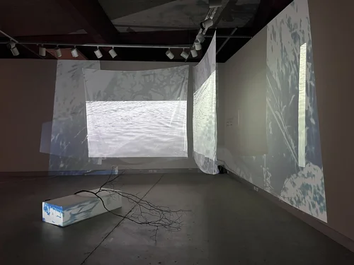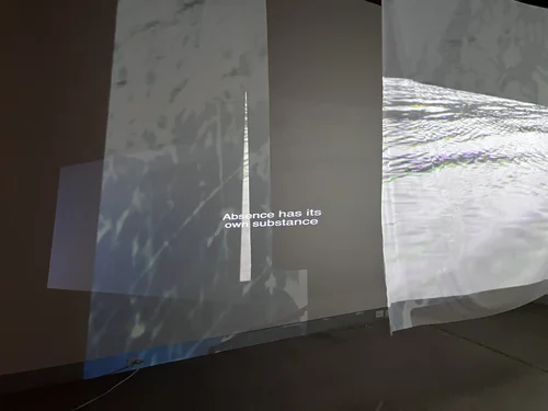 “where the rupture meets the road” offers a space to contemplate the substance of absence. Projections fill the space with images of water and illegible cyanotype, while two sets of speakers bring the sounds of the Danube and Mississippi Rivers into the room. Three phrases are repeated in Yiddish, with translations appearing and disappearing on the wall through video projection: